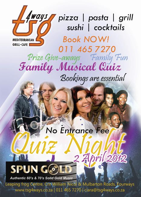 Starting on 2nd April, Spun Gold provides a family musical quiz for the patrons of TSG Mediterranian Restaurant in Fourways on the FIRST MONDAY EVENING OF THE MONTH. No Cover Charge. Make sure you book a table for a great evening out – suitable for all ages.